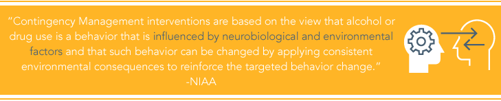 Contingency Management is applied in a person’s everyday life from the time they are little, by parents, teachers, siblings, coaches, and friends. As a person grows up, some learned behaviors can stick around and as they enter into the workforce, they may continue to be rewarded for hard work. Whereas they may be punished for other behaviors, such as drug and alcohol use. “Contingency Management interventions are based on the view that alcohol or drug use is a behavior that is influenced by neurobiological and environmental factors and that such behavior can be changed by applying consistent environmental consequences to reinforce the targeted behavior change.” NIAAA The theory is that if a person’s environment is forcibly changed, so will their actions–i.e. if an action is rewarded, it is more likely to be committed again, and vice versa.